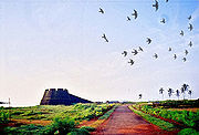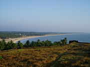 The landscape is dominated by the characteristic coconut palms accompanying rolling hills and streams flowing into the sea. The landscape is dotted with tiled-roof buildings, topped with the famous Kasaragod tiles made with the local hard red clay and typically walled with laterite blocks. Older houses are commonly found with elaborate wood-work.